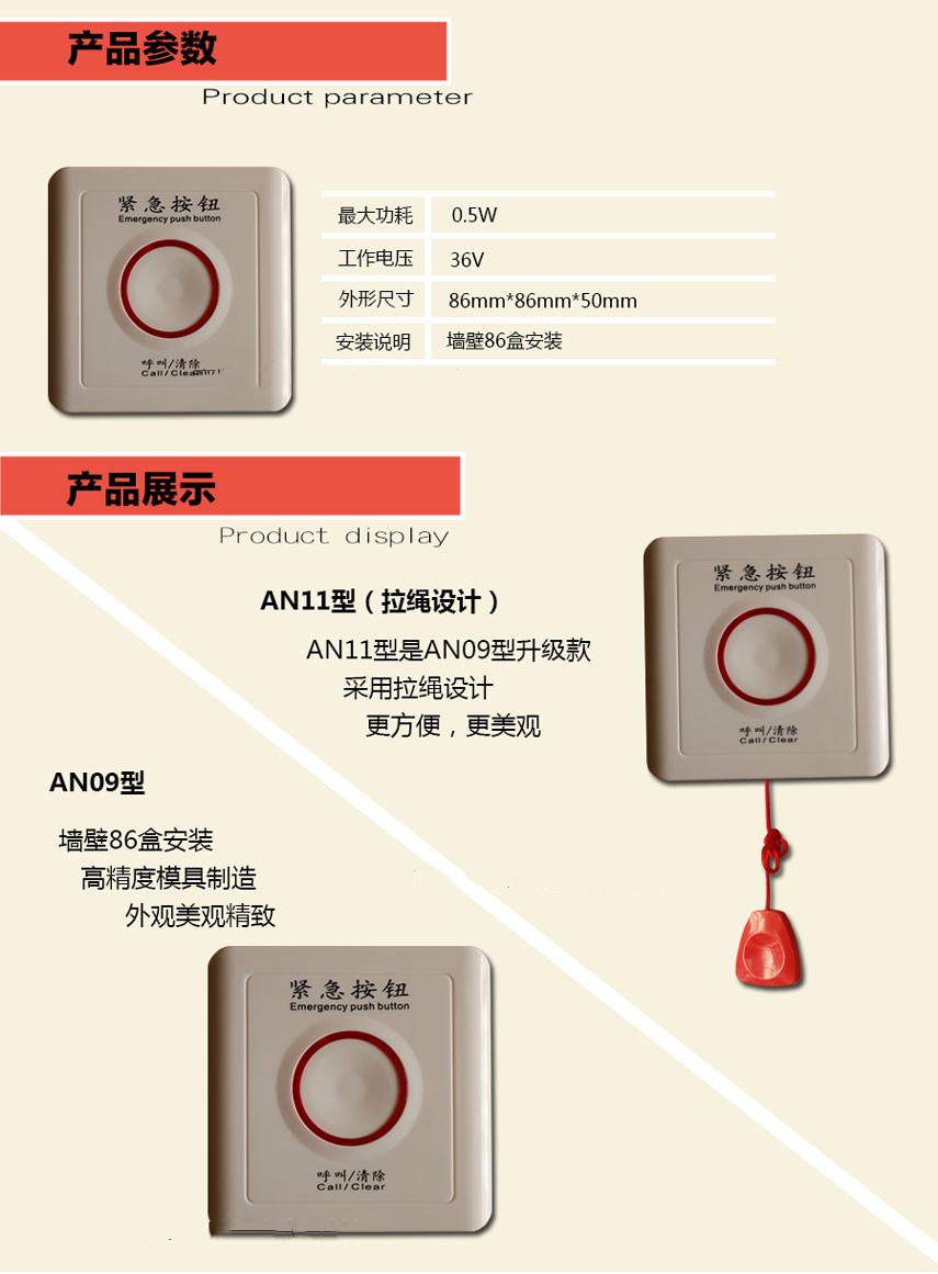 開 作者 衛(wèi)生間緊急按鈕 0 評論 09J衛(wèi)生間緊急按鈕 產(chǎn)品名稱:09J衛(wèi)生間緊急按鈕規(guī) 格:長:86mm寬:86mm厚:50mm產(chǎn)品備注:墻壁86盒安裝功 能:用于衛(wèi)生間 09J型與8系列主機配套 09JH型與9系列配套 ◆緊急情況下呼叫主機;適用于衛(wèi)生間等易淋水場所